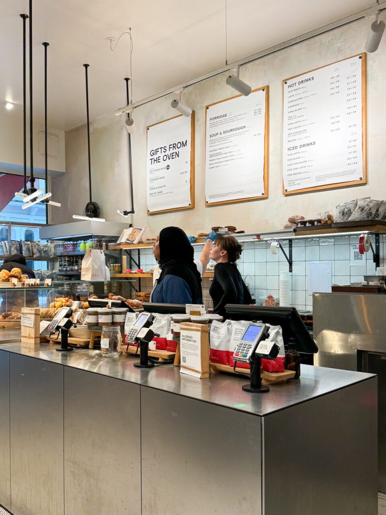 Gail’s to sieć piekarni, gdzie możesz zjeść pyszne śniadanie na słono lub słodko. Jest to zdecydowanie tańsza wersja niż dwie poprzednie, ale również szybsza. Dla nas było to idealnym rozwiązaniem w dniu, w którym mieliśmy zaplanowanych całkiem sporo atrakcji. Nie chcieliśmy poświęcać zbyt dużo czasu na śniadanie, więc zamówiliśmy po kawie i rogaliku. Wyszło nas to ok. 6 funtów na osobę.