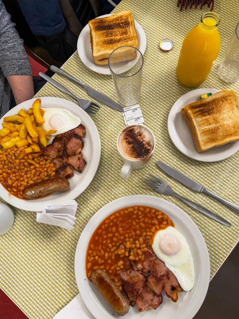 Najbardziej zależało mi na zjedzeniu typowego english breakfast w Regency Cafe i się udało! To bardzo oblegany bar niedaleko Westminster, w którym serwowane jest tradycyjne angielskie śniadanie, oceniane jako najlepsze w Londynie! Co to znaczy? English breakfast to śniadanie na ciepło, w skład którego najczęściej wchodzi smażona kiełbaska, fasolka w sosie pomidorowym, smażone plastry bekonu i jajko smażone. Dużo smażonego, prawda? Do tego kawa lub herbata i często tost.