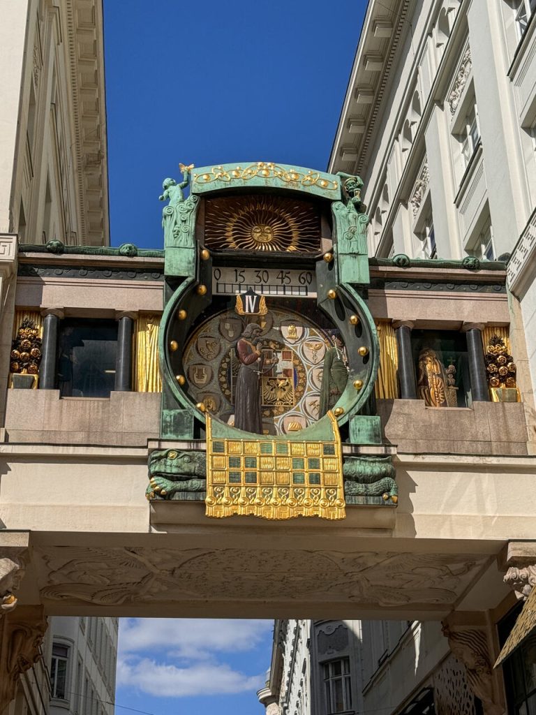 Z kawiarni ruszyliśmy spacerem w stronę Ankeruhr – słynnego zegara kotwicznego z ruchomymi figurami, który co godzinę przyciąga uwagę turystów. To secesyjne dzieło rzeźbiarza Franza von Matsch warto obejrzeć w południe. Dlaczego? Wtedy wszystkie figurki z zegara paradują w rytm melodii.