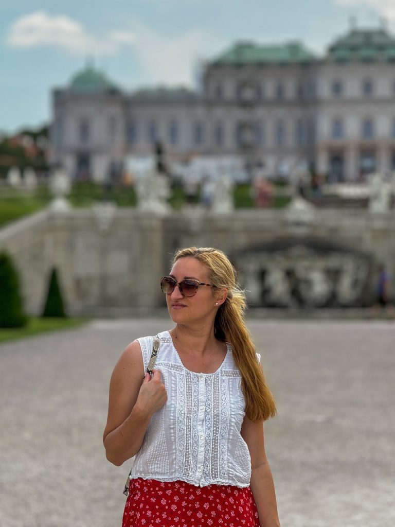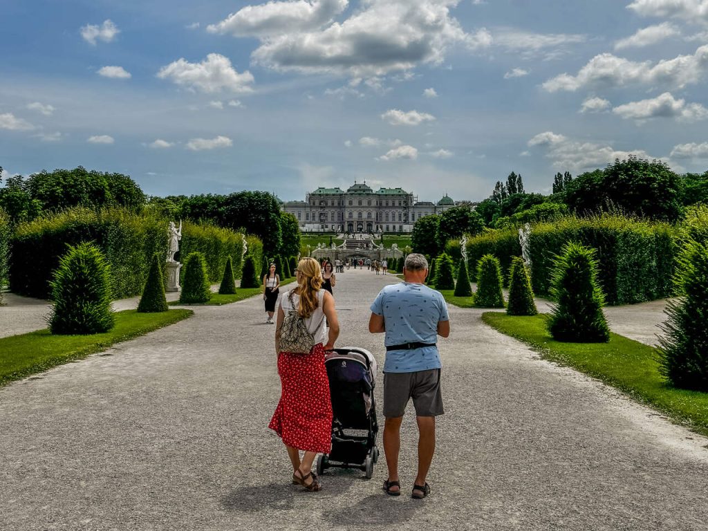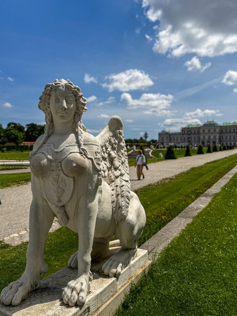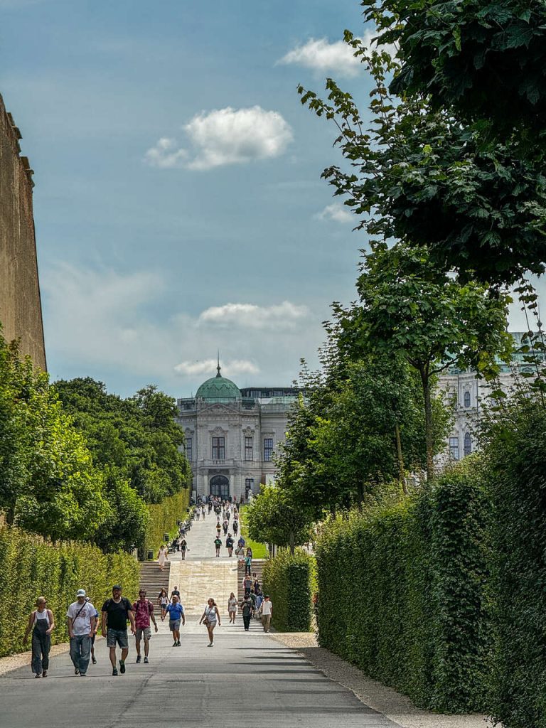 Stamtąd ruszyliśmy spacerem w stronę Belwederu. Wchodzimy od strony Dolnego Belwederu. Ogrody tego kompleksu są naprawdę imponujące – symetryczne, zadbane i z pięknym widokiem na pałac. Nie wchodziliśmy do środka, ale sam spacer był absolutnie wystarczający. Górny Belweder to obecnie muzeum sztuki, w którym zobaczysz m.in. słynny obraz Gustava Klimta „Pocałunek”.