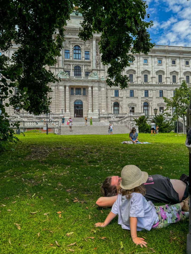 Drugi dzień zaczęliśmy od pikniku w Burggarten. Była piękna pogoda, więc po przyjeździe do centrum, złapaliśmy kawę na wynos, wyciągnęliśmy z plecaka przekąski dla Anastazji i usiedliśmy na trawie z widokiem na Hofburg.