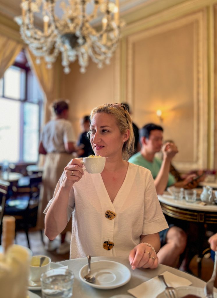 Jeśli zamierzasz wpaść do Café Demel, musisz wiedzieć, że czeka Cię stanie w kolejce przed wejściem. Kawiarnia codziennie jest oblegana, ale warto chwilę poczekać na stolik! A mój werdykt? Ciasta były bardzo dobre, a kawa raczej taka sobie. Czy przyszłabym jeszcze raz? Dla tego wnętrza i klimatu pewnie tak!
