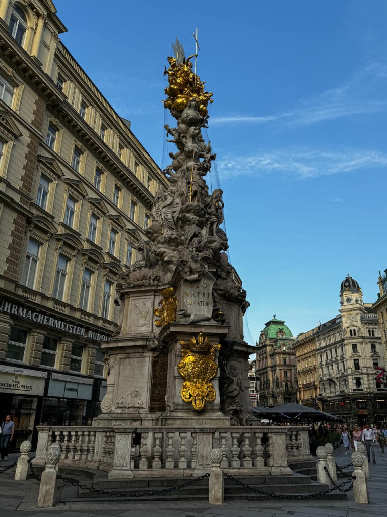 Po chwili znaleźliśmy się na Graben, jednej z najbardziej reprezentacyjnych ulic Wiednia, gdzie zatrzymaliśmy się przy Kolumnie Trójcy Świętej. To barokowy pomnik upamiętniający koniec epidemii dżumy – jeden z najbardziej charakterystycznych punktów miasta.