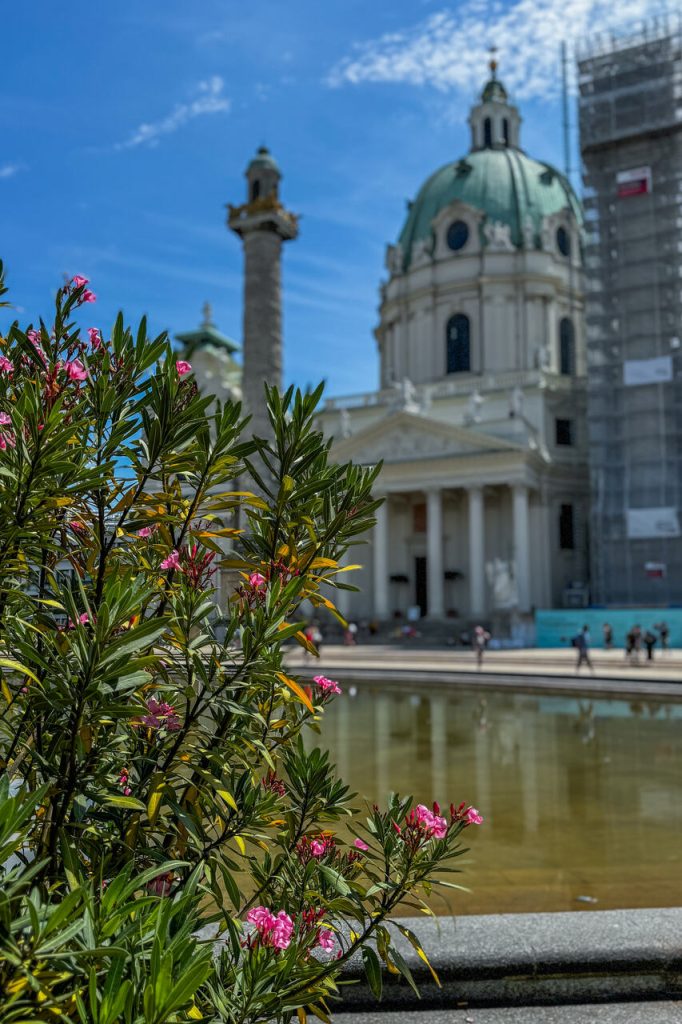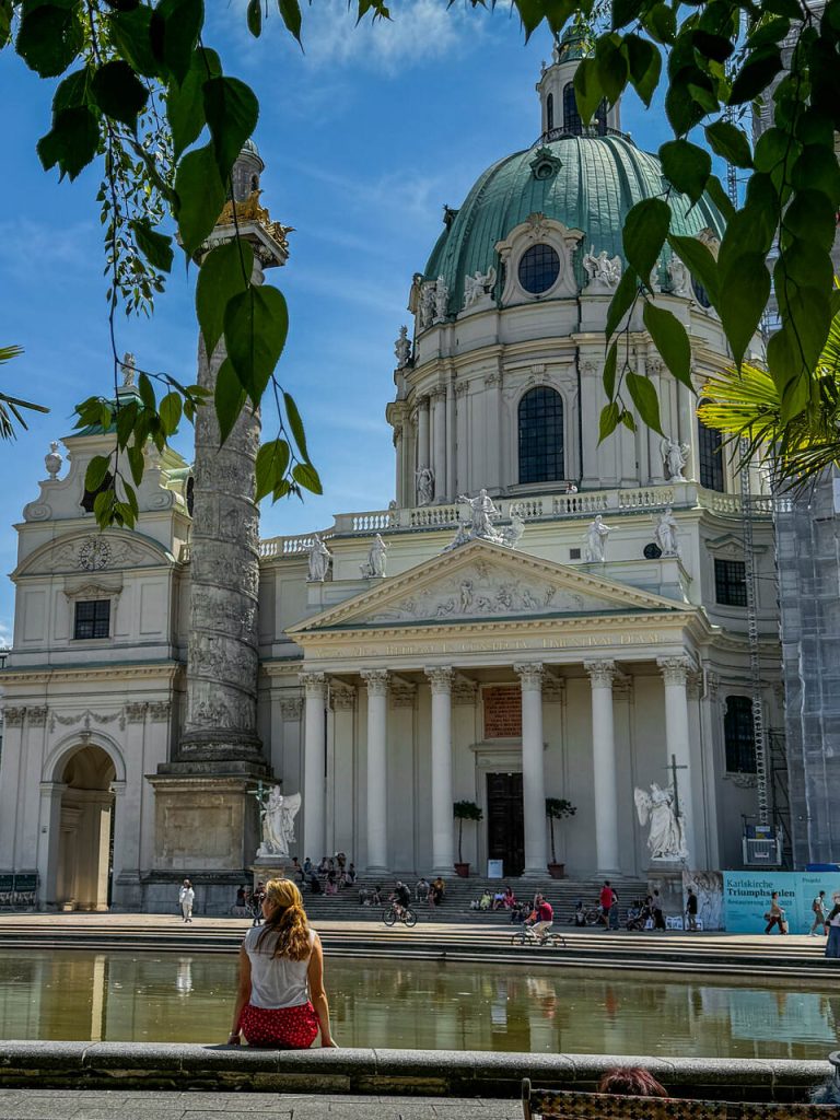Kolejnym przystankiem był kościół św. Karola Boromeusza. To jedno z najpiękniejszych barokowych miejsc w mieście. Wstęp i zwiedzanie kościoła jest płatne, ale jeśli chcecie jedynie wejść na chwilę i zerknąć, to wystarczy wspomnieć, że chcecie wejść na modlitwę. Przed kościołem znajduje się niewielki staw – i to właśnie tam zrobiliśmy dłuższą przerwę. Była kawa i zabawa na placu zabaw (Kinderspielplatz Falco).