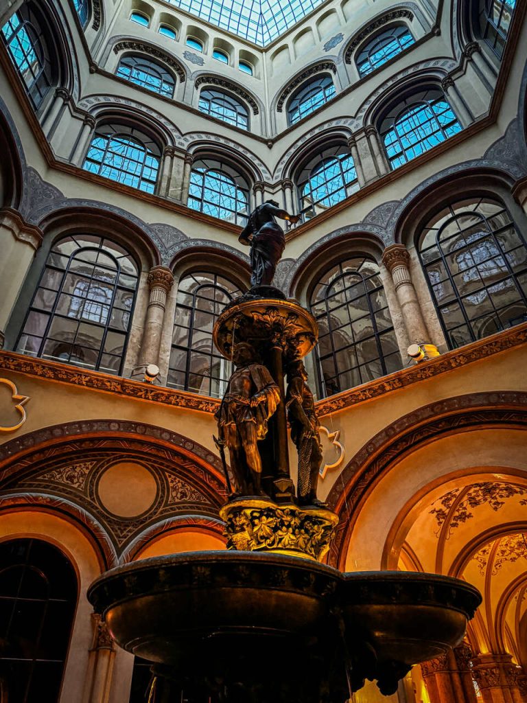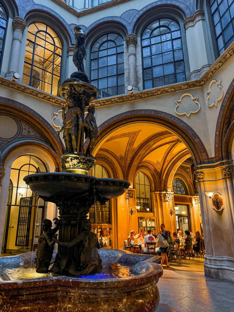 Wracając do apartamentu, trafiliśmy jeszcze na mniej oczywiste, ale bardzo klimatyczne miejsce – przepiękny pasaż w Pałacu Ferstel, gdzie zobaczyliśmy fontannę Donaunixenbrunnen. Pasaż łączy ulicę Herrengasse i plac Freyung. To taki ukryty spot, dzięki któremu przenosimy się w czasie. W pasażu znajdziesz luksusowe sklepiki, kawiarnię czy antykwariaty.