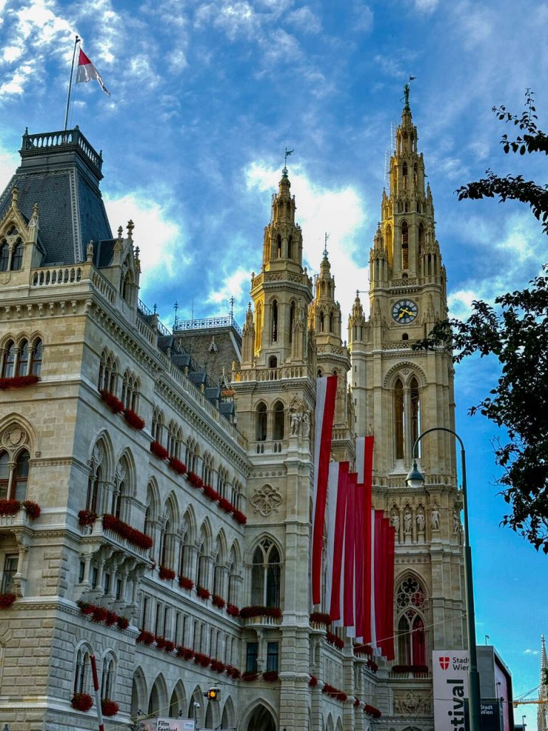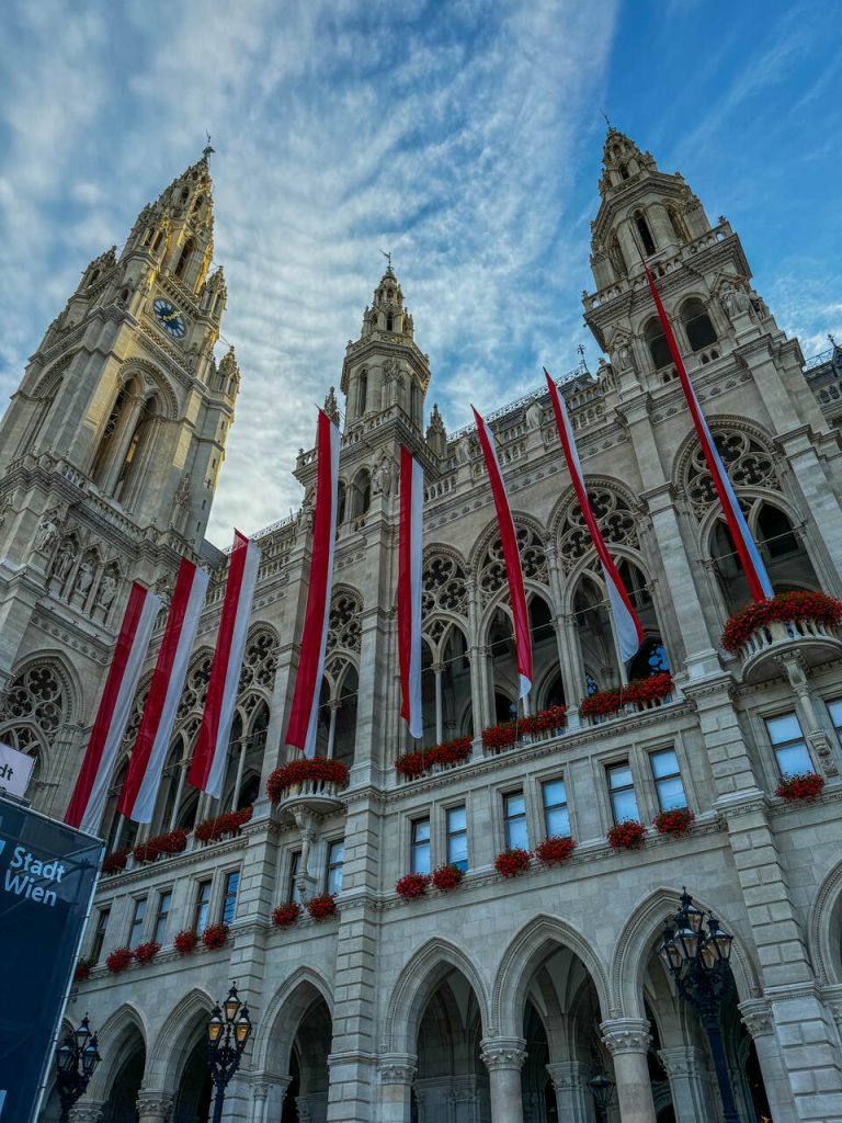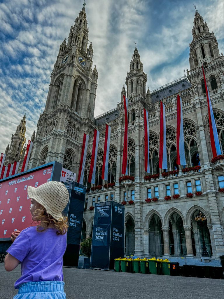 Zaczęliśmy od okolic Rathaus, czyli wiedeńskiego ratusza. To ogromny, neogotycki budynek, który od razu robi wrażenie skalą i detalami. W sezonie często odbywają się tu różne wydarzenia, a zimą działa słynny jarmark świąteczny. Uwaga, na terenie parku ratuszowego znajduje się plac zabaw.